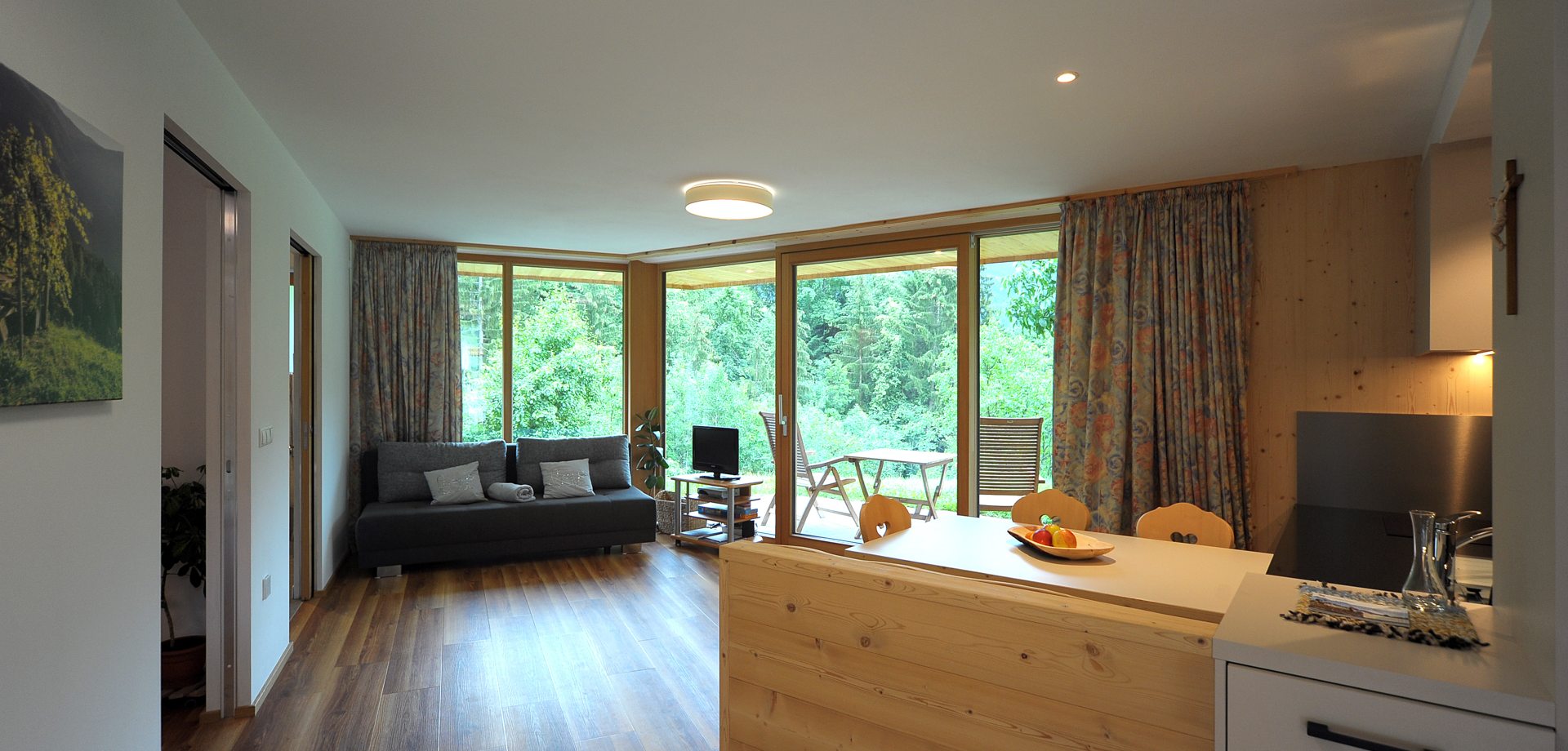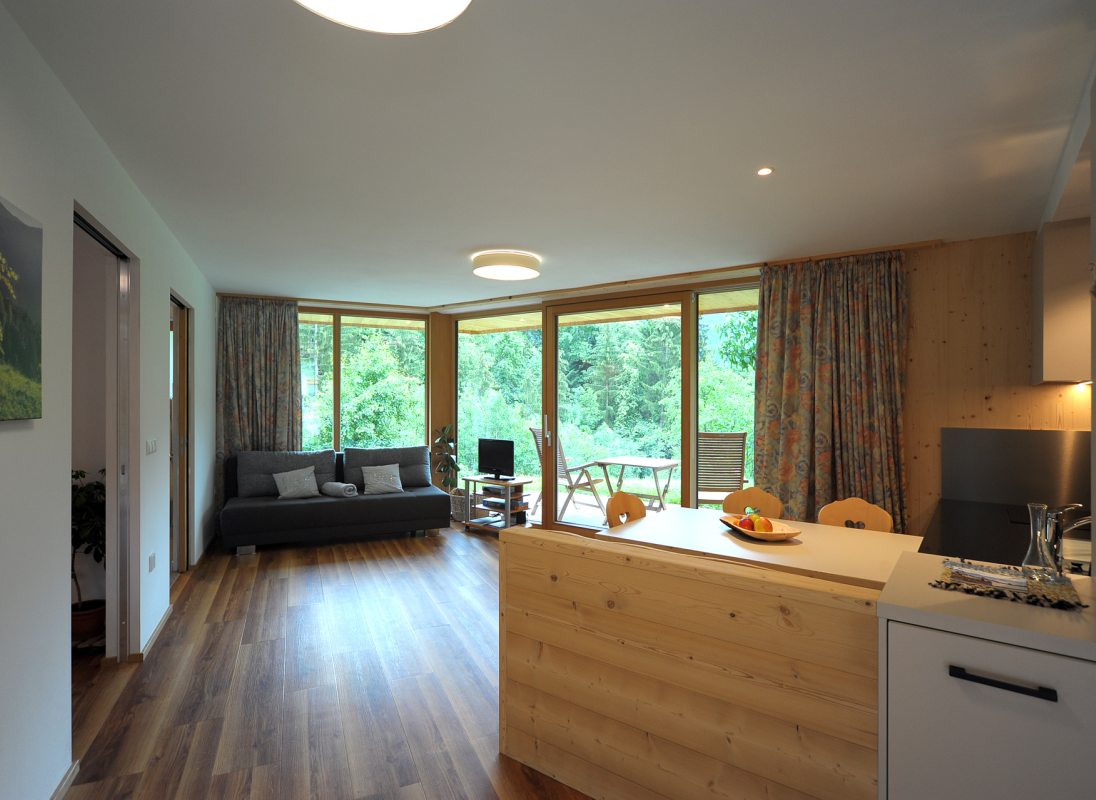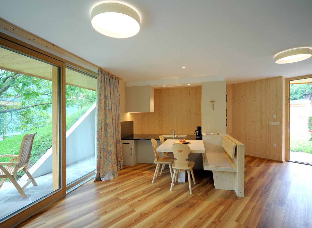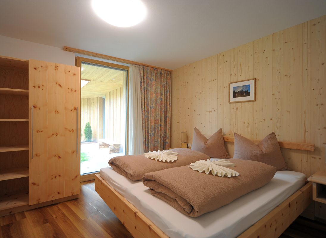 Das Chalet „Herbstparadies” ist besonders für romantische Urlaubstage zu Zweit und für Kleinfamilien geeignet. Das Chalet bietet ein Doppel-Schlafzimmer aus Massivholz und bei Bedarf steht ein Kinderbett bereit. Im Ess- und Wohnbereich befindet sich ein ausziehbares Doppelschlaf Sofa mit TV- und Lese-Ecke, das zum gemütlichen Filmabenden und schmökern einlädt. Der private Außenbereich ist vom Ess- und Wohnbereich aus erreichbar mit Blick auf die Berge.